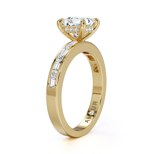18k white gold cushion cut with diamond set gallery rail and tapered bullet cut diamond shoulders