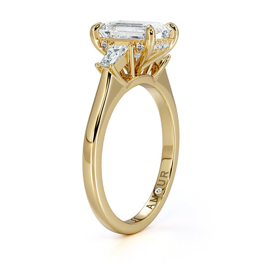 18k white gold emerald cut with diamond set gallery rail and tapered baguette cut diamond shoulders