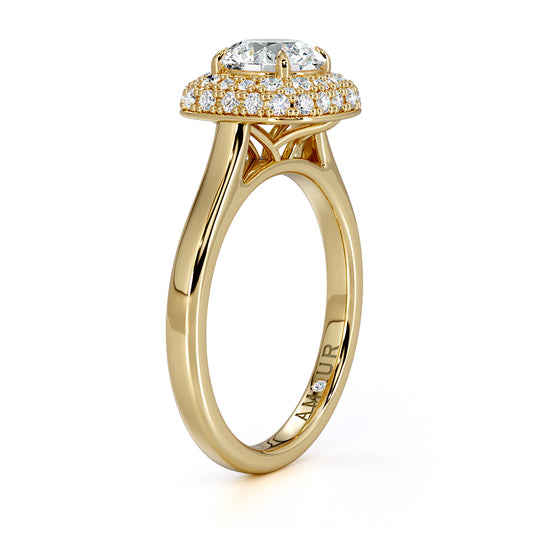 18k white gold cushion cut with micro pave set diamond halo with split V shank diamond set shoulders