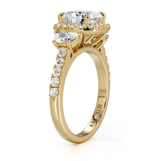 18k white gold cushion cut with pave set halo and half moon and billiant cut shoulders