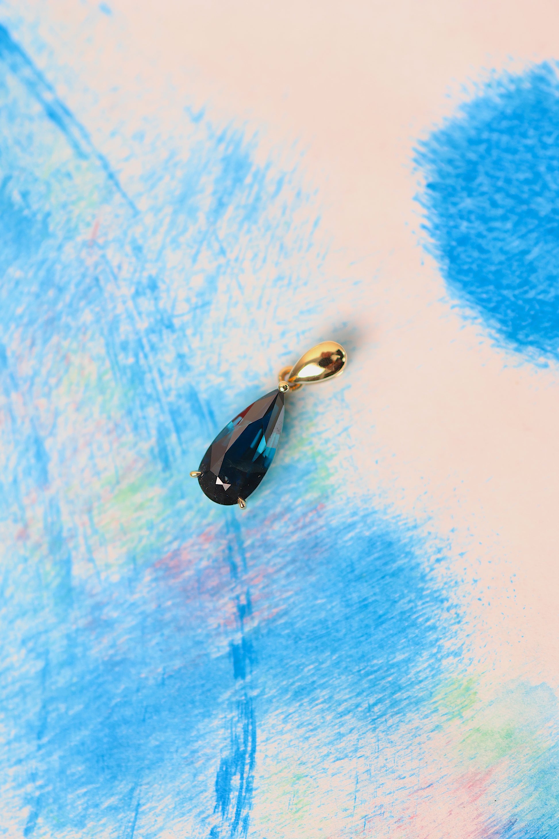 Featuring a striking 2.2ct Elongated Blue Pear Sapphire in a secure three-claw setting, this pendant showcases refined craftsmanship with its chunky bale design.