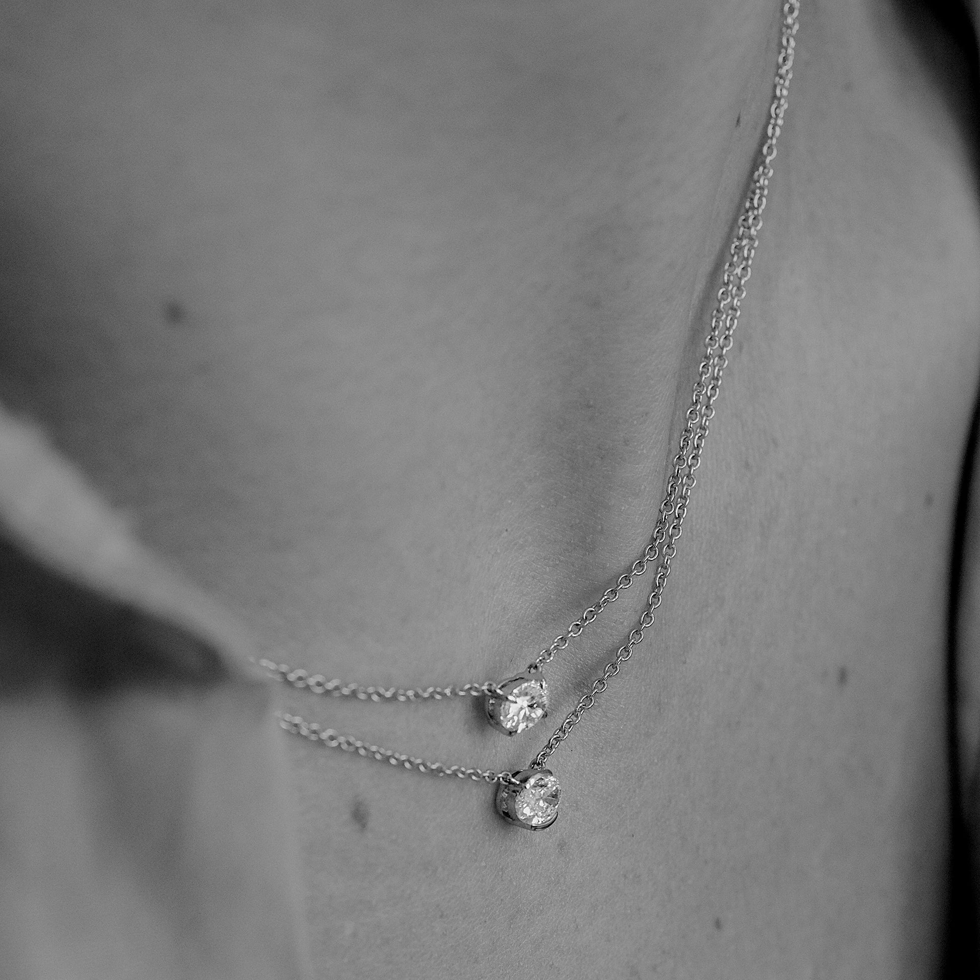 Our Eliana east-west set oval diamond necklace, a piece that embodies sophistication and refinement. This necklace features a dazzling 0.32-carat oval diamond, masterfully set in a half bezel, suspended gracefully from a delicate 18K gold chain. The diamond, boasting exceptional F color and VS clarity, adds an exquisite radiance to this exquisite accessory.