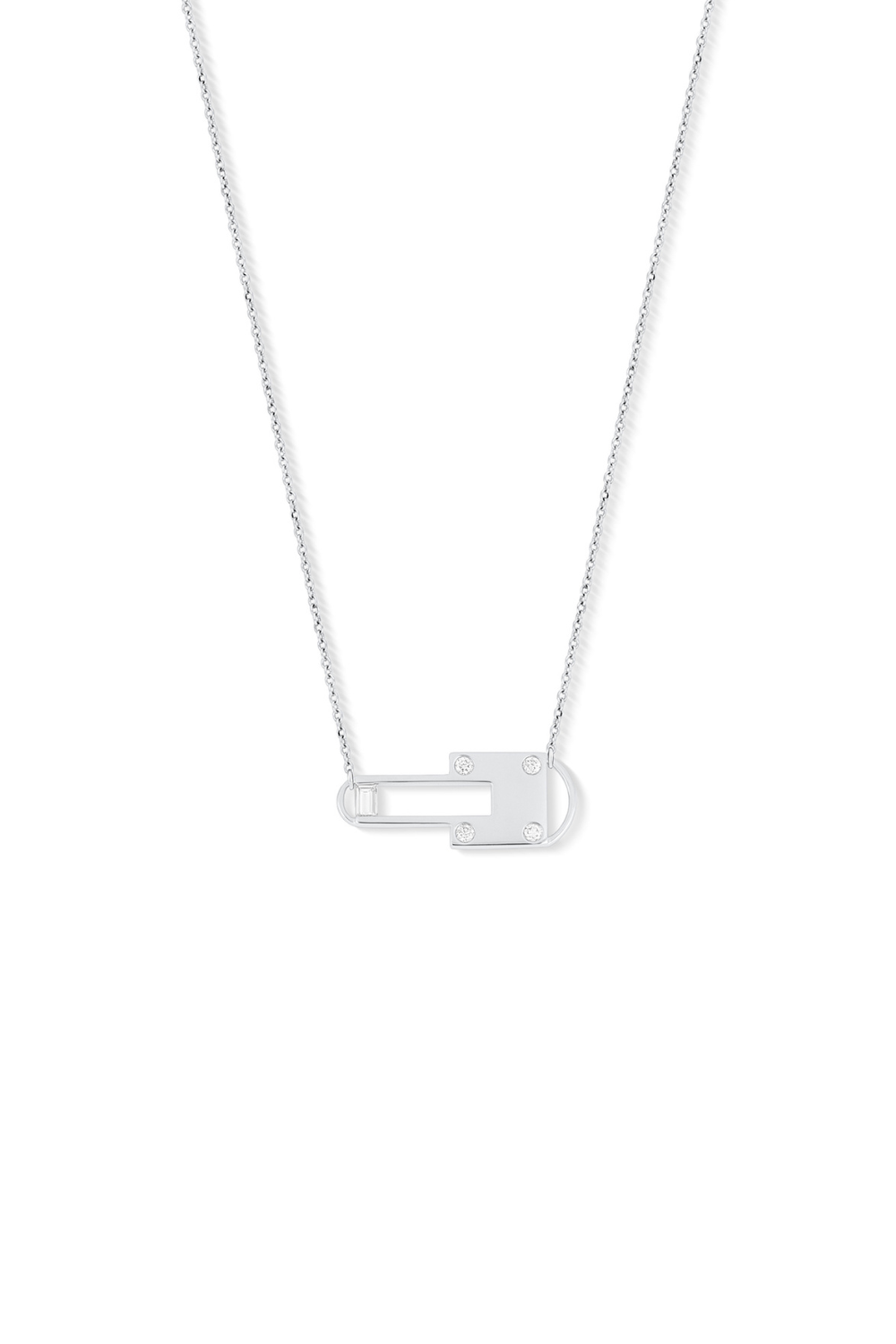 The 18K gold Esme necklace features a unique hardware design, enhanced by four round brilliant diamonds and a single baguette cut diamond. With F colour and VS clarity, the diamonds total 0.26ct, and the cable chain is securely soldered to each side.