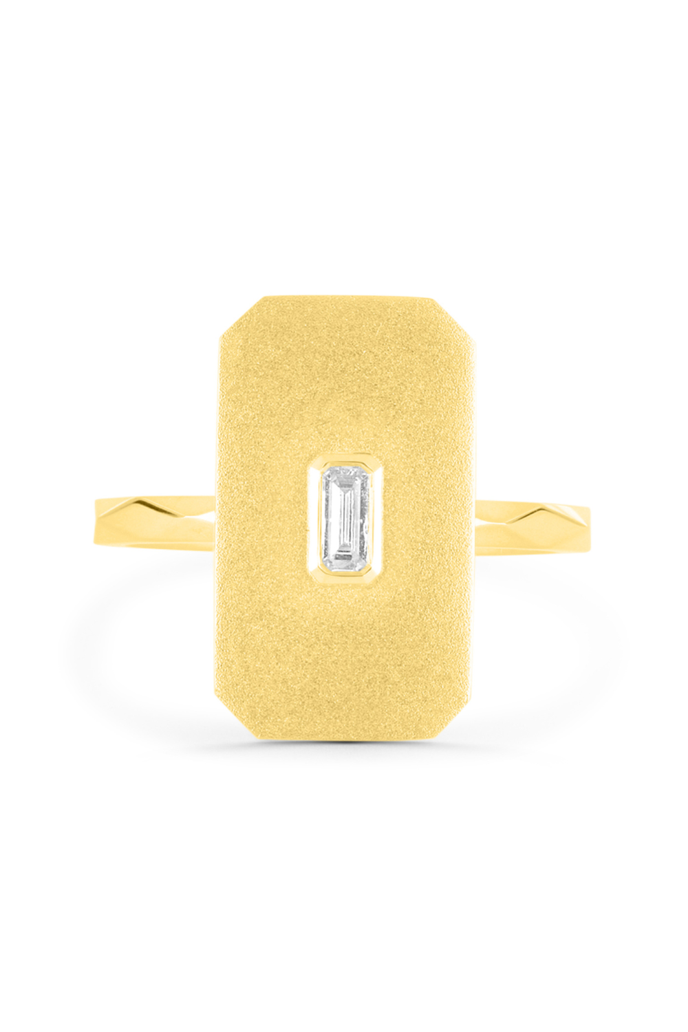 The Olivia, a solid gold faceted band, featuring an elongated 17 x 10mm cut corner rectangular face adorned with a vertically set 0.10ct Baguette diamond. The band's polished facets beautifully contrast with the slightly brushed finish on the face. The diamond, boasting exceptional F color and VS clarity, adds a touch of brilliance to this exquisite piece. To complete the look, our matching necklace and earrings perfectly echoes the sophistication of the ring.
