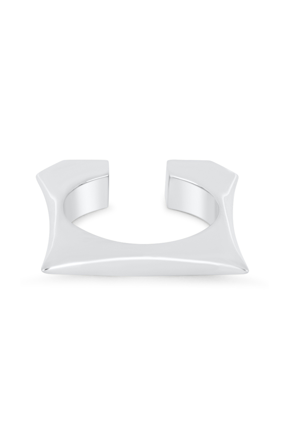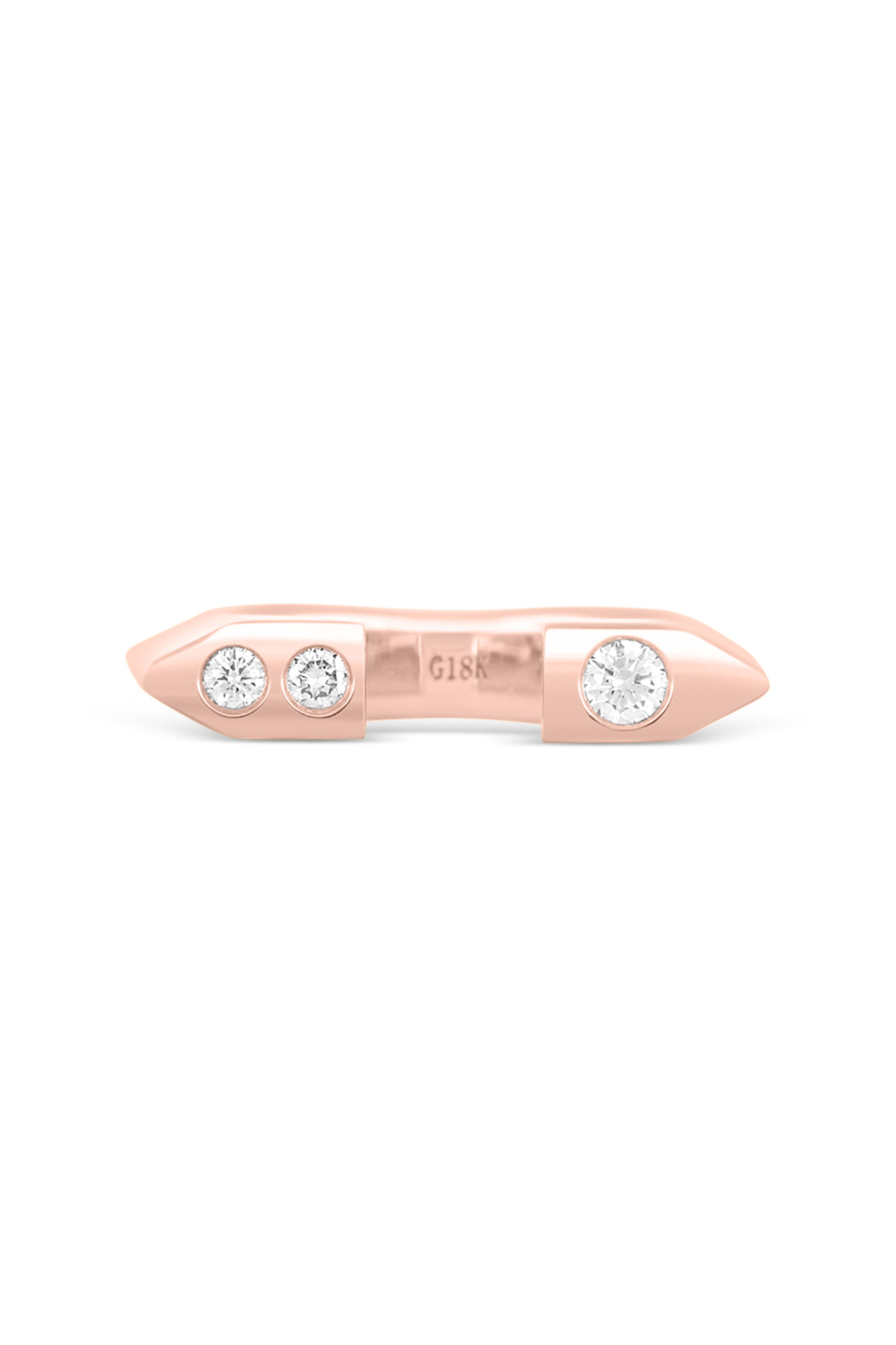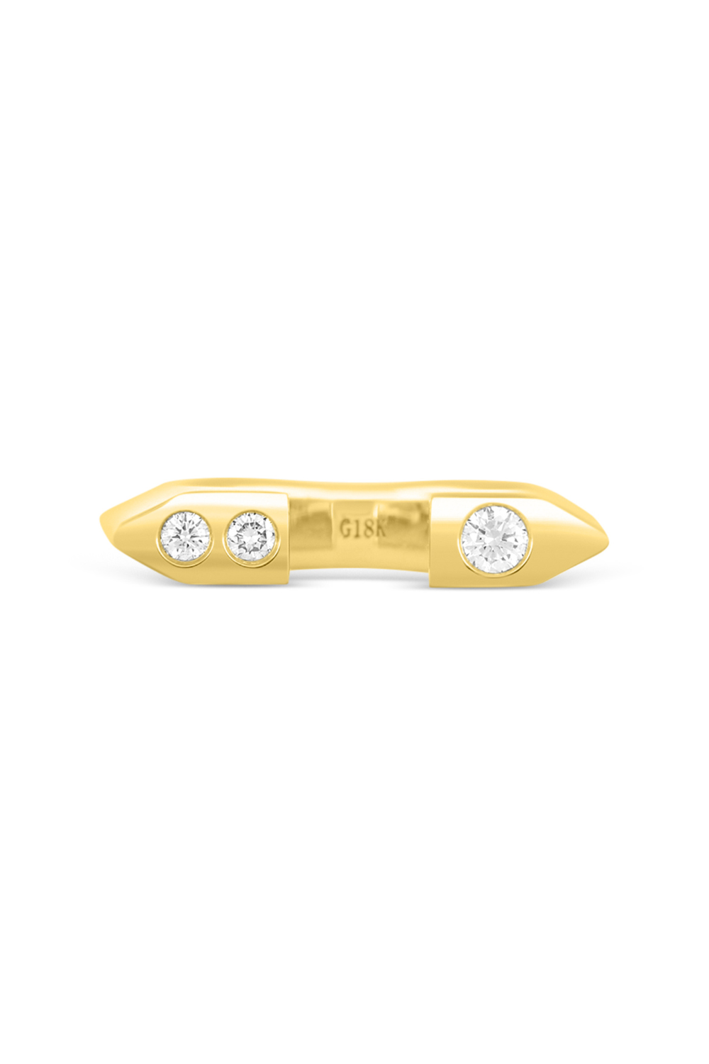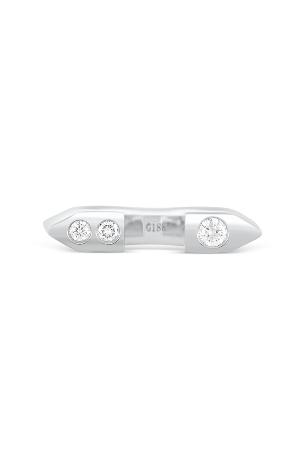 Set yourself apart with our Peyton. Featuring an exaggerated cushion shaped knife edge profile, this piece is set off by the pair and single round brilliant cut diamonds of F colour and VS clarity totalling 0.21ct, adding to its uniqueness.